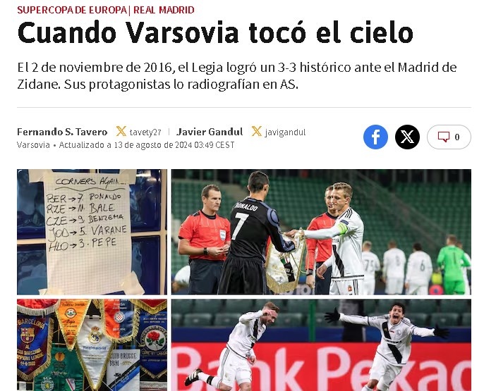 8月13日报道 2016年欧冠,波兰球队华沙莱吉亚曾3-3战平皇马。当时华沙莱吉亚的球员雅库布和吉尔莫接受采访,回忆了这段经历。