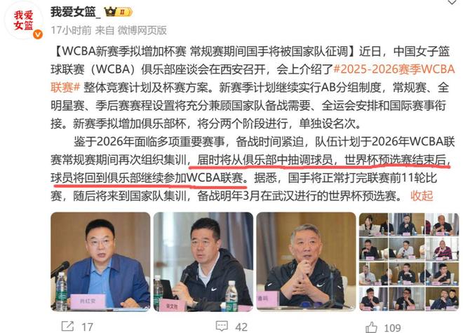 而在近期,据媒体我爱女篮报道,新赛季的WCBA计划继续实行AB分组制度,常规赛、全明星赛、季后赛赛程设置将充分兼顾国家队备战需要,全运会安排和国际赛事衔接。而鉴于2026年面临多项重要赛事,备战时间紧迫,中国女篮计划于2026年WCBA联赛常规赛期间再次组织集训,届时将从俱乐部中抽调球员,世预赛结束后,球员将回到俱乐部继续参加WCBA联赛。