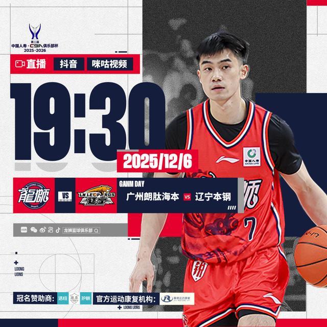 龙狮篮球俱乐部2025-12-06 15:02:44第二届中国人寿·CBA俱乐部杯小组赛 第三场⏰2025年12月6日 今晚 19:30广州朗肽海本 - 辽宁本钢直播:咪咕视频 & 抖音CBA俱乐部杯