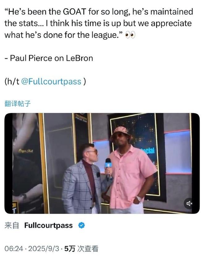 皮尔斯也是进一步表示:“詹姆斯已经是GOAT很久时间,他始终保持出色数据。我们感激他为这项运动带来的贡献,感激他从乔丹退役后,就扛起NBA联盟大旗。詹姆斯是NBA传奇之一,我们对此心怀感激,但我觉得他的时代该落幕了,我们会永远铭记他为NBA所做的一切。”