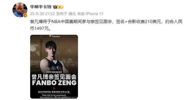 根据最新报道,曾凡博将在NBA中国赛期间举办亲签见面会,而参加见面会进行签名与合影的收费是210美元,折合人民币1497元。