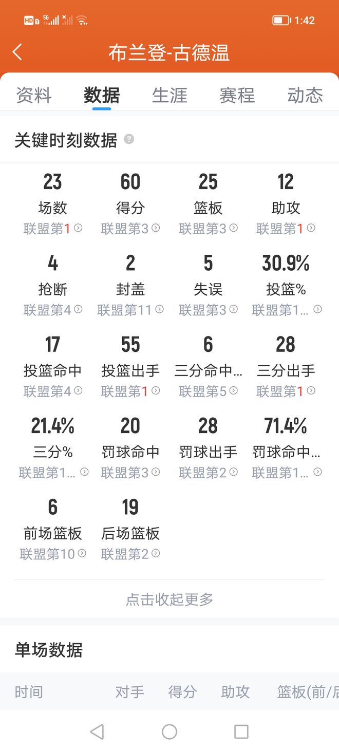 古德温拥有一个大心脏,绝对的关键先生。数据统计,上赛季他有23场比赛打出关键数据,累计贡献60分的关键得分,25个关键篮板以及12个关键助攻。这四项数据均联盟前五水平。
