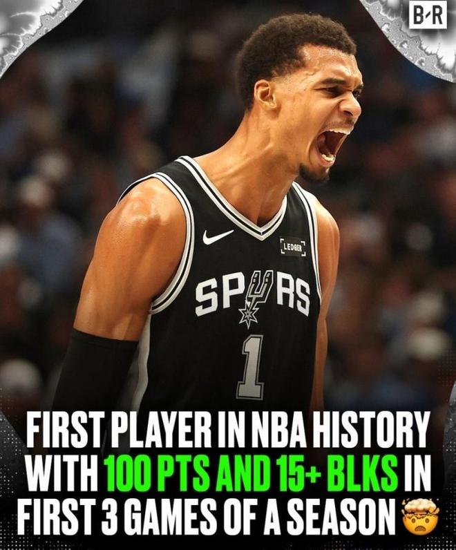 同时,文班亚马还创下了NBA历史第1的神迹。据统计,文班亚马开赛季前三战合计得到至少100分15帽,NBA历史首人。