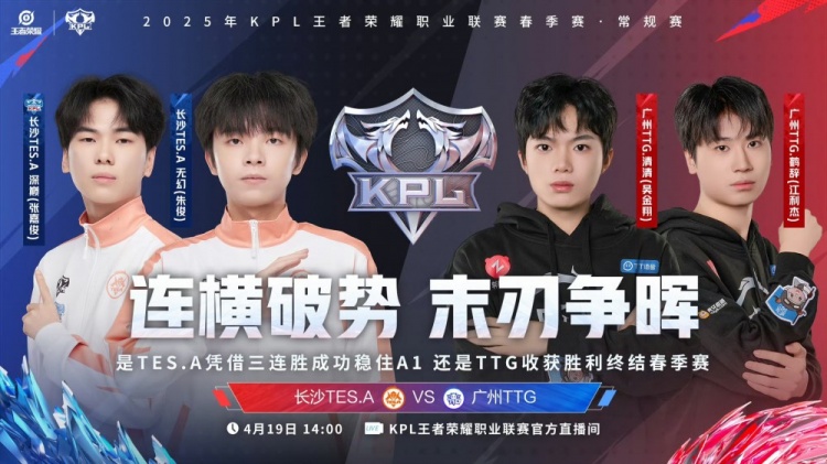 4月19日讯 2025KPL春季赛今日第一场比赛是由长沙TES.A对阵到广州TTG!
