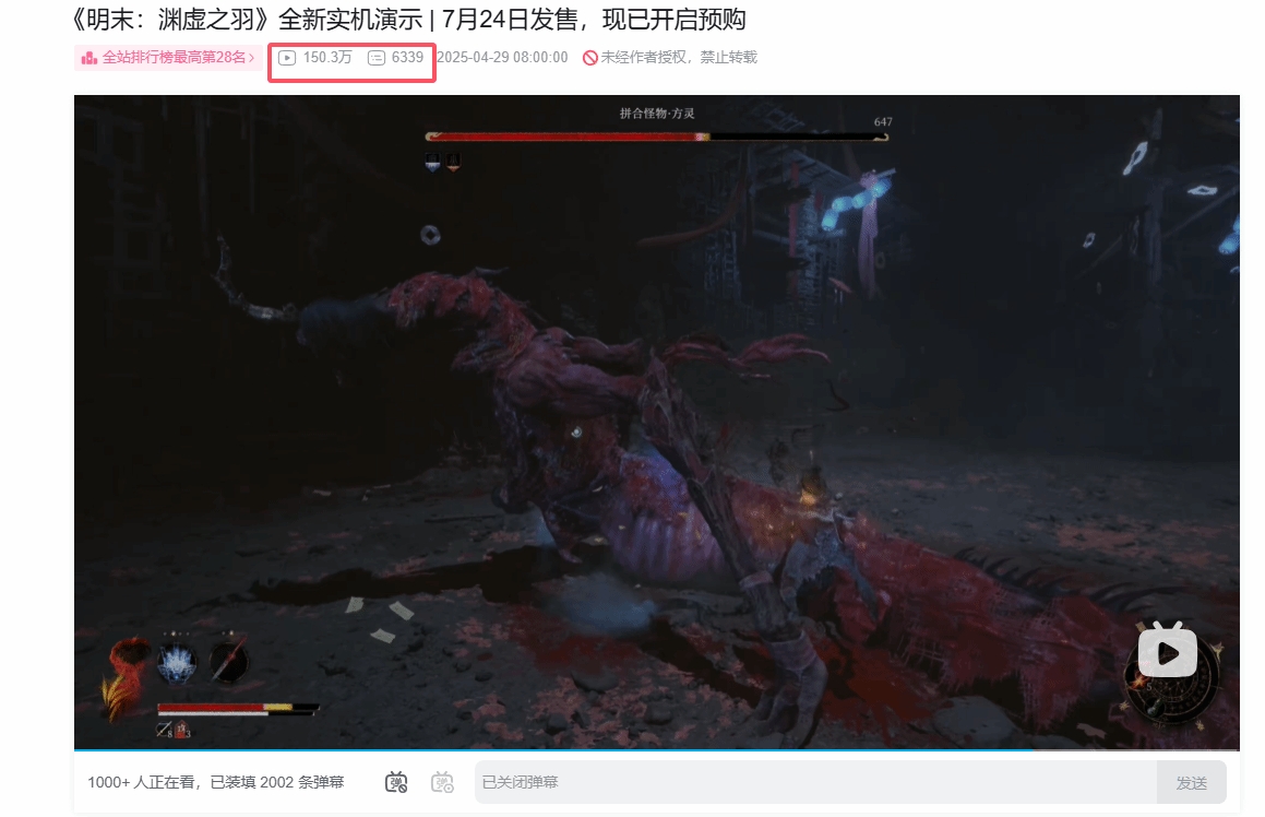 4月30日讯 备受玩家们期待的国产类魂ARPG游戏《明末:渊虚之羽》于近日正式公布发售日期,预计将于2025年7月24日正式发布。《明末》的最新实机演示“完美新娘·方灵”BOSS战公布仅一天时间,播放量就已经突破了150万次!而且这个数字还在不断上涨!而同时发布的预购版奖励展示视频的播放量目前也已经达到了72.4万,突破100万也只是时间问题。