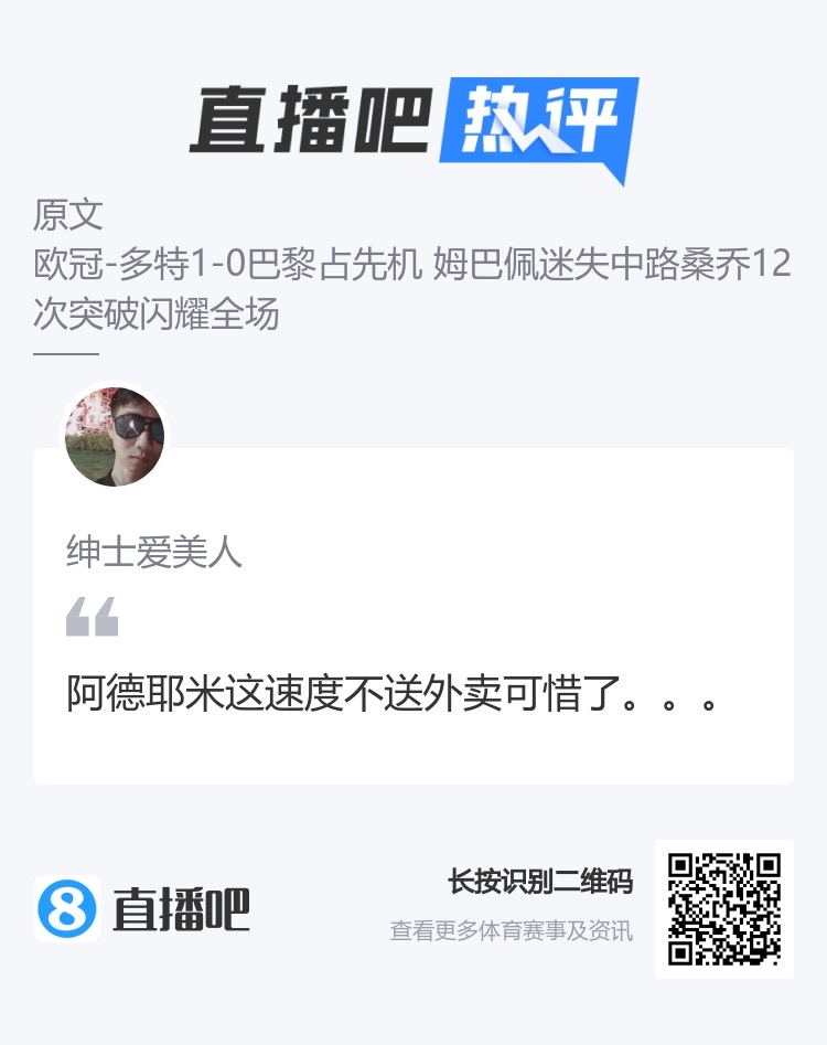 05月02日讯 欧冠半决赛首回合,多特主场1-0巴黎。本场阿德耶米多次回防还有一次边路爆趟。吧友点评阿德耶米:这速度不送外卖可惜了阿德耶米边路爆趟阿德耶米回追断球