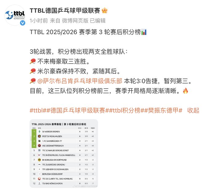 18日早些时候,德甲官方微博发布德甲第3轮赛后积分排名榜,樊振东所在的萨尔布吕肯俱乐部两胜一负,累计4积分,排名上升至第三。