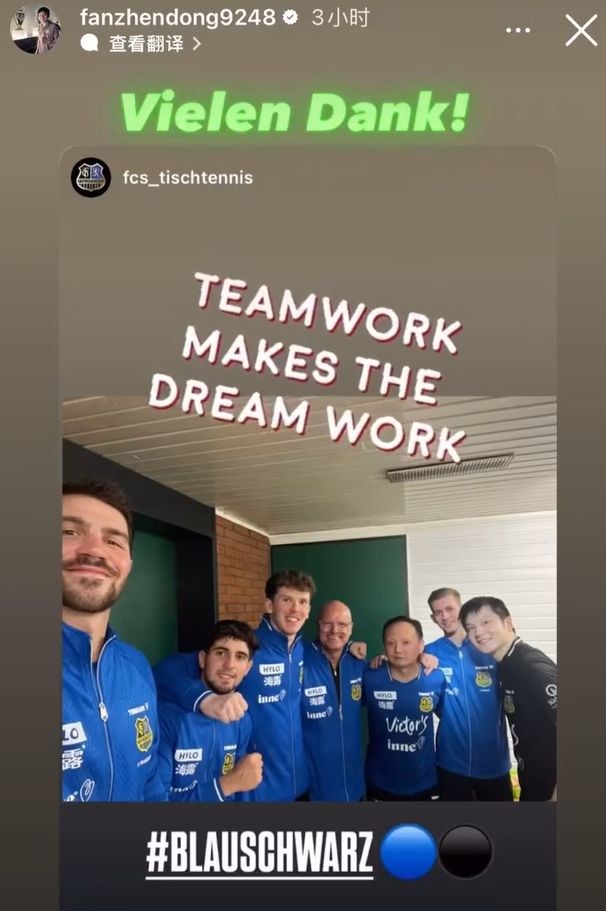 赛后,樊振东更新社媒,在球队以“团队合作成就梦想”为主题的大合影中用德语写下:“非常感谢!(Vielen Dank)”
