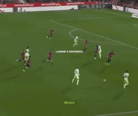 在进攻端,拉菲尼亚+巴尔德的左翼组合配合默契,通常能压制对手;拉菲尼亚打反击、利用空间的能力一流,亚马尔在右翼拿球时,拉菲尼亚高速斜插到中路,形成呼应;拉菲在左翼推进时,亚马尔向中路靠拢,这也是一大杀招。
