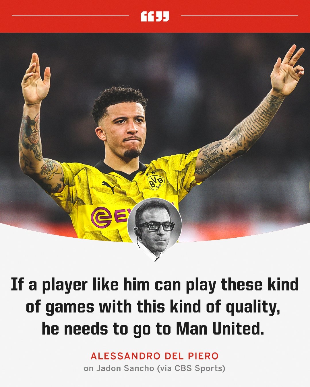 意大利传奇球星德尔皮耶罗在CBS的节目中,盛赞桑乔:“在这种级别的比赛,要是有像桑乔这样高品质发挥的球员,那他该去曼联。”