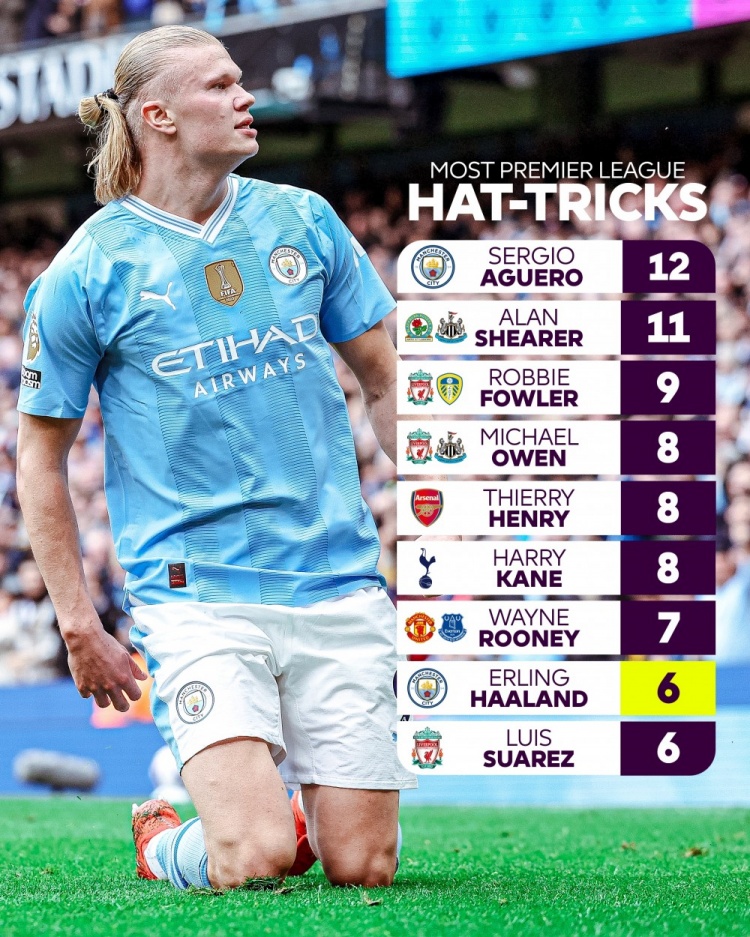 英超生涯第6帽!哈兰德英超戴帽数追平苏亚雷斯暂列历史第8