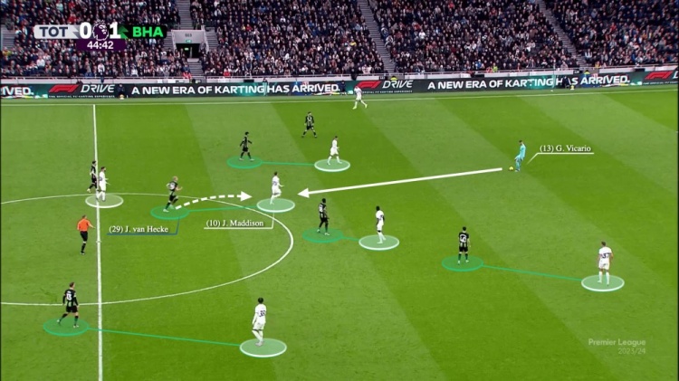 比如布莱顿客战热刺的比赛中,也是球员队球员的逼抢。布莱顿中后卫保罗-范海克跟随麦迪逊进入热刺半场。波斯特科格鲁的球队在中路利用中场球员的跑动来打破僵局,因为范海克的位置太靠前了。