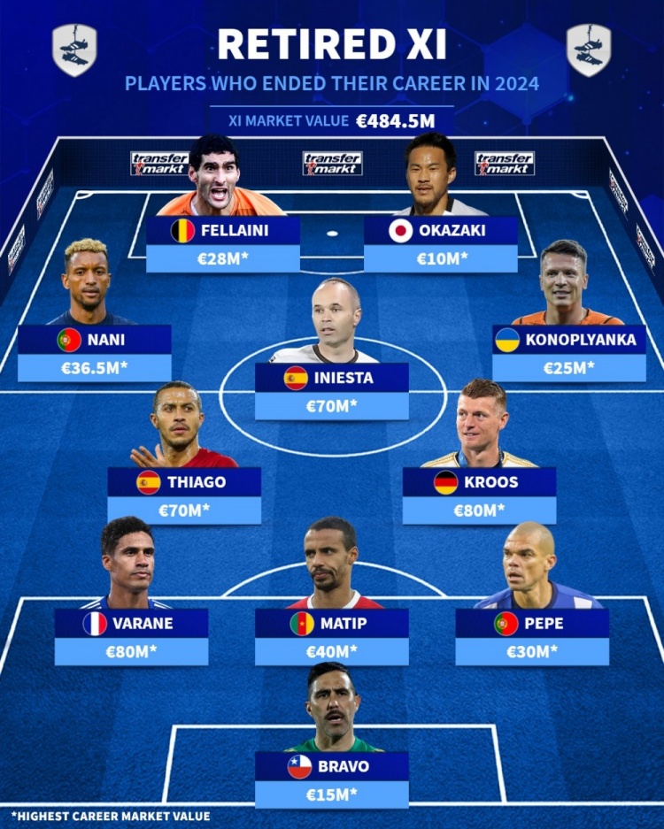 1月1日报道 德国转会市场列出了2024年退役阵容,伊涅斯塔、克罗斯、瓦拉内、佩佩在列。德转列2024年退役阵容(巅峰德转身价,总价4.845亿欧):门将:布拉沃(1500万欧)后卫:瓦拉内(8000万欧
