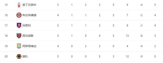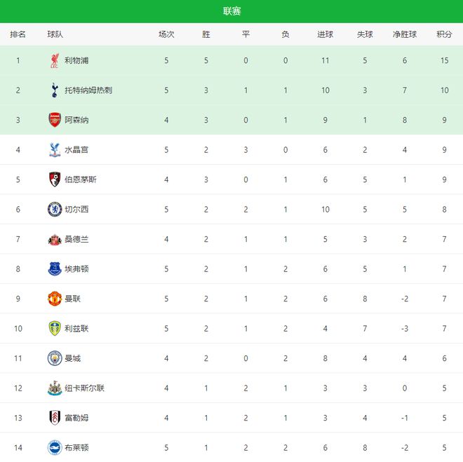 随着比赛结束,英超积分榜最新出炉:利物浦5战全胜领跑,阿森纳和热刺紧随其后,这三支球队新赛季开局还是相当不错,瓜迪奥拉的曼城少赛一场,仅仅只积6分!另一边,狼队继续惨淡。他们主场1-3不敌利兹联,遭遇开局5连败,积0分稳居英超副班长,保级警报已经提前拉响;大马丁的维拉也好不到哪里去,虽然少赛一轮,但是一球未进,仅仅只2分,排在倒数第二。