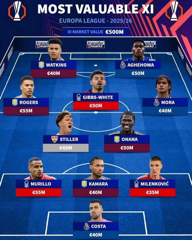 德转列本赛季欧联杯最贵阵:沃特金斯领衔维拉4人,英超占7席