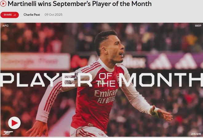 官方:马丁内利被球迷票选为了队内9月份最佳球员,巴西人得到了54%的支持。马丁内利9月份在对毕尔巴鄂竞技的欧冠比赛中替补登场贡献1球1助攻,几天后,这名前锋又在对曼城的比赛中