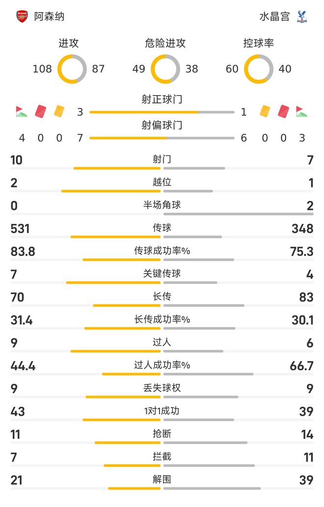 角球数据,阿森纳4次,水晶宫3次。过人数据,阿森纳9次尝试过人其中过人成功率44.4%,水晶宫6次尝试过人且过人成功率66.7%。