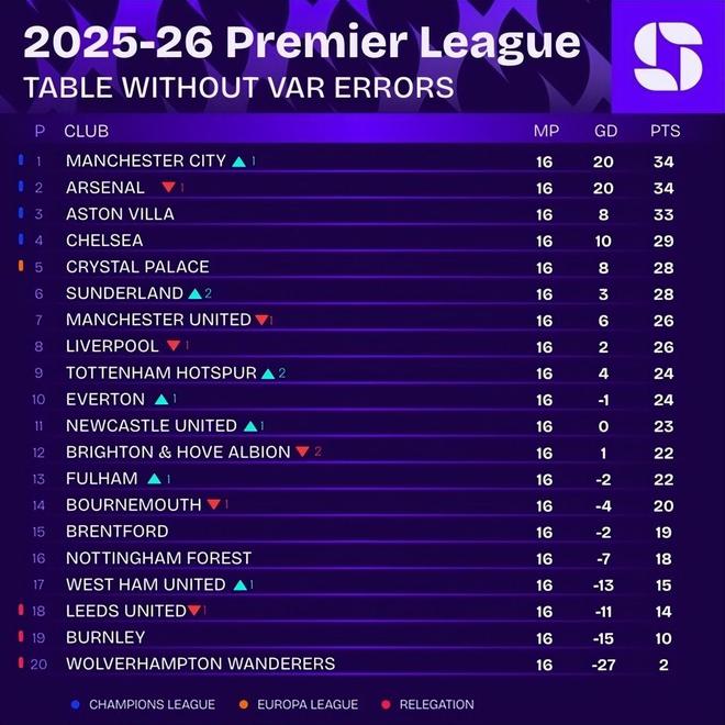 Squawka统计去除VAR判罚错误后的英超积分榜情况,曼城、阿森纳排名前二。